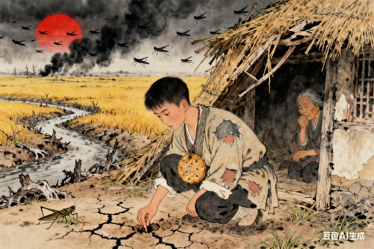 至正四年的濠州,太阳像块烧红的铁饼挂在天上。地里的庄稼早被蝗灾啃得只剩光杆,河沟里的水干得能看见开裂的泥块,空气里飘着一股焦糊的味道,连风刮过都带着燥热的尘土。十六岁的朱重八蹲在自家茅草屋前,手指抠着地上的硬土,耳朵里全是父母咳嗽的声音——瘟疫像无形的毒蛇,已经缠上了这个贫苦的农家。