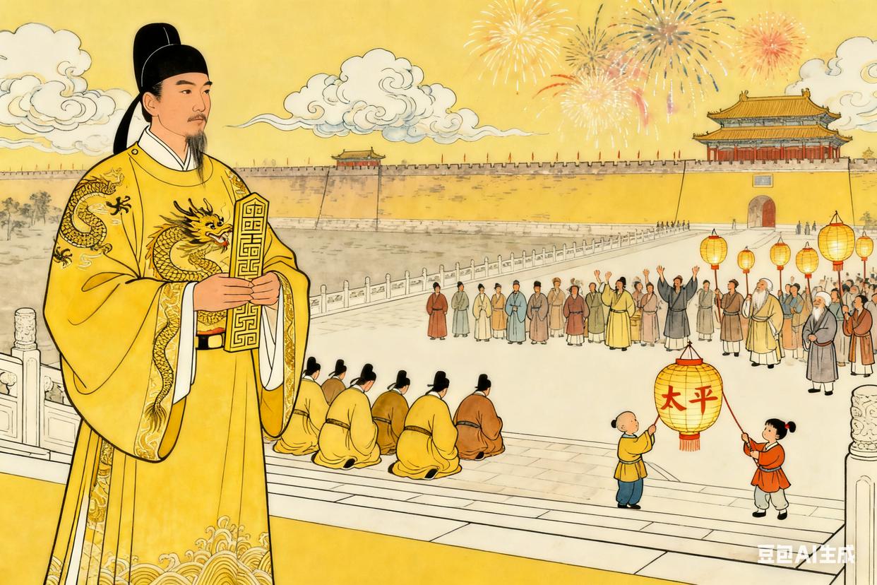 洪武元年正月初四,应天府的皇宫里,朱重八穿着龙袍,站在祭天台上。当礼官喊出“登基”的那一刻,他看着台下跪拜的大臣,看着远处的百姓,忽然想起了二十多年前,那个在濠州荒地里埋葬父母的孤童。眼泪差点掉下来,他赶紧稳住情绪,对着天地拜了三拜,说:“朕朱重八,今日登基,国号大明,定年号洪武。朕发誓,必当勤政爱民,让天下百姓安居乐业,不负苍生!”那天,应天府的老百姓都涌上街头,敲锣打鼓,欢呼雀跃。有个老人拉着朱重八的衣角,哭着说:“咱们汉人,终于又有自己的江山了!”