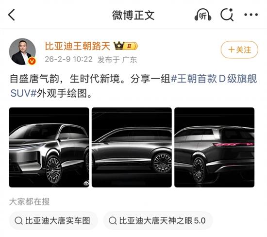 比亚迪王朝网销售事业部总经理路天在日前发布品牌首款D级旗舰SUV的外观手绘图,这款新车正是此前持续预热的“大唐”,其预计于2026年上半年正式上市,这也标志着比亚迪正式进军高端大型新能源SUV赛道。