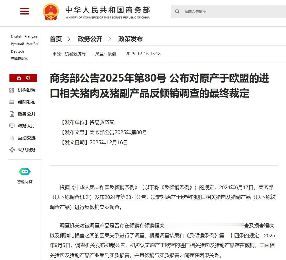 这一切的答案,藏在12月16日一份沉甸甸的公告里,就在这天,中国监管层不再沉默,正式决定对原产于欧盟的进口相关猪肉及猪副产品征收反倾销税。
