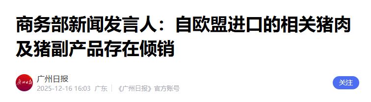 信息来源:《商务部新闻发言人:自欧盟进口的相关猪肉及猪副产品存在倾销》广州日报2025-12-16 16:03
