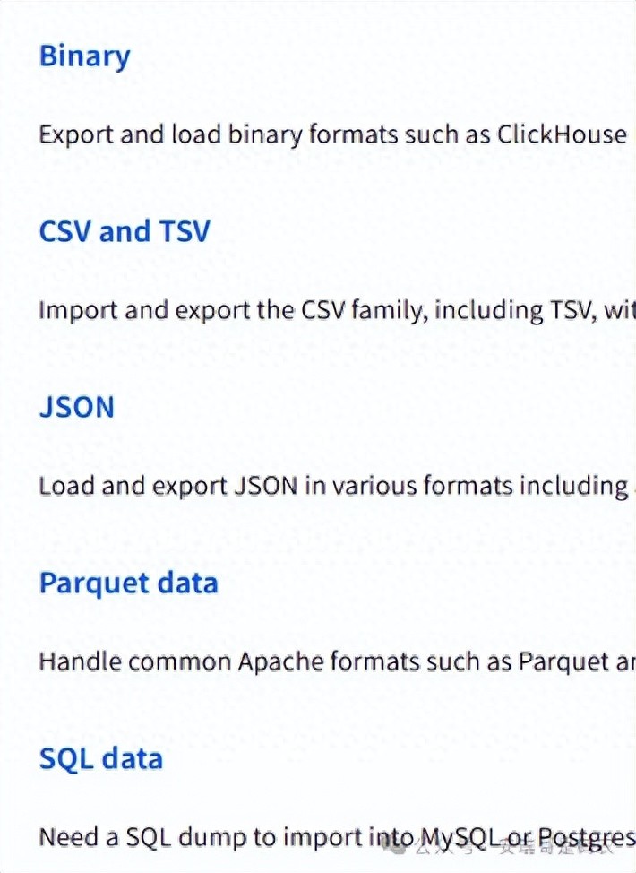 CK 官网支持的导出文件格式有:CSV、TSV、JSON、Parquet 等。