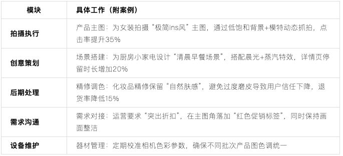工作场景:60%摄影棚(搭景/拍摄)、20%外景(服装/家居拍摄)、20%后期室(修图/剪辑)协作对象:主要与电商运营团队、设计师、市场部等合作,确保拍摄内容符合品牌需求---