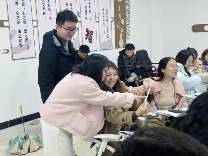 在看见中彼此赋能。随后,李老师邀请老师们两两结对,完成一份温暖的“传声”:在纸条上写下观察到的对方三个优点或最近做得好的事情,当面念出来并真诚赠予。“阳光有能量”“共情能力强”……这些不常被宣之于口的闪光点,在此刻化作文字与话语,形成了强烈的积极反馈。这个环节意在提醒:我们不仅是并肩作战的同事,更是能彼此“看见”、相互滋养的同行者。