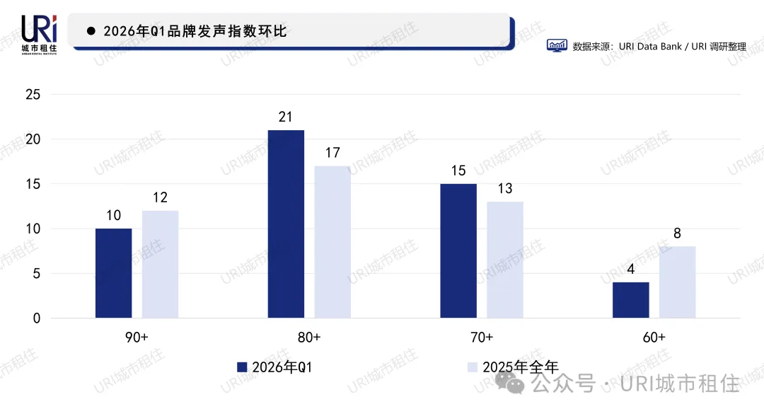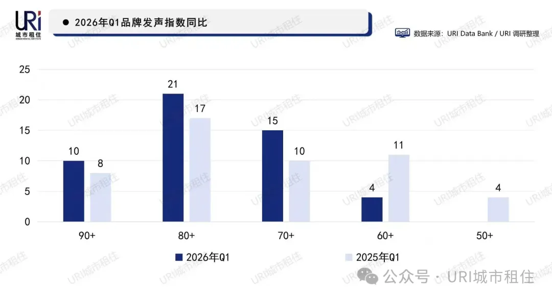 2026年第一季度,国企长租品牌整体发声活跃度同比全面提升,品牌声量建设进入“主动化、常态化、场景化”的全新阶段。从同比数据来看,2026年一季度所有上榜企业发声指数均在60以上,发声指数在90以上的企业数量提升25%,发声指数80+以上企业数量提升24%。