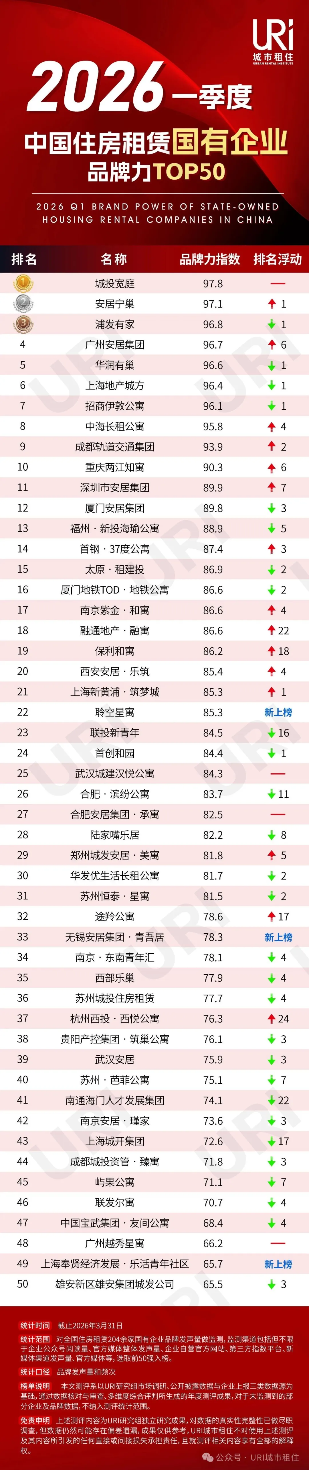 在此背景下,URI城市租住重磅发布《2026年一季度中国住房租赁国有企业品牌力TOP50》,解码国企公寓赛道的竞争逻辑与发展趋势。