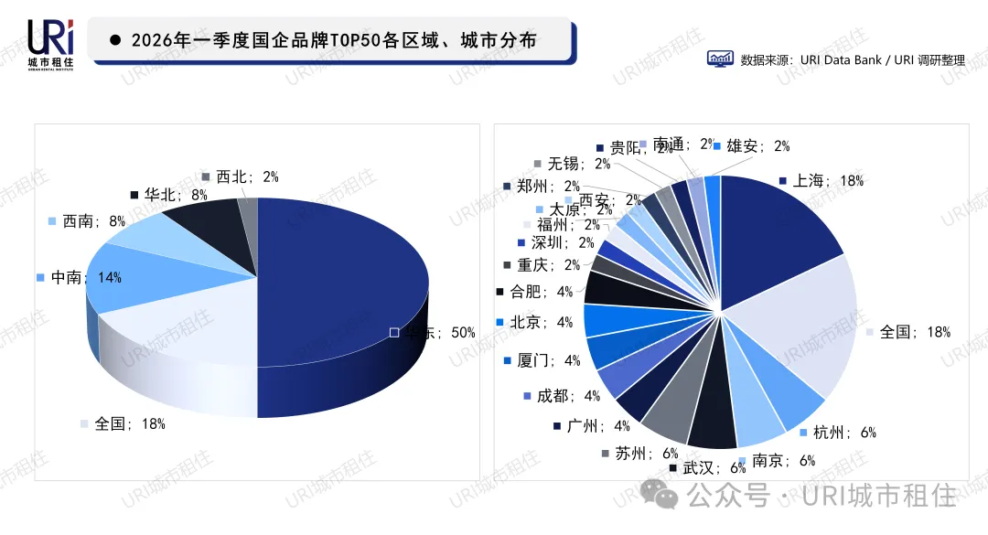2026年一季度,国企长租品牌头部格局高度稳固,TOP10与去年重合度达70%,城投宽庭、安居宁巢、浦发有家等头部品牌持续领跑。区域层面,华东以上海为核心占据半壁江山,而西南、中南等地仅少数品牌突围,城市间分化显著、行业活跃度有明显分化。