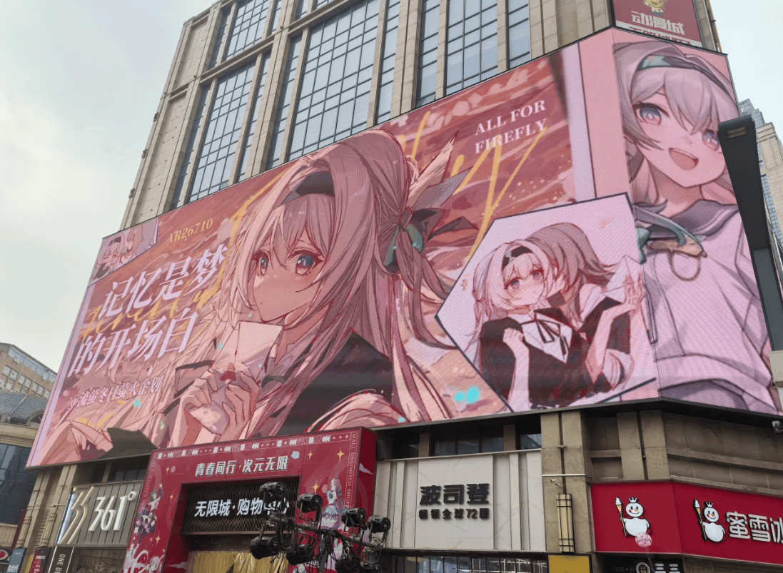 这不,就有一位大佬为了给自己喜爱的角色应援,居然斥巨资包下32个省份共100座城市的线下大屏幕,用来投放流萤的宣传片,打造专属于流萤的“痛楼”。