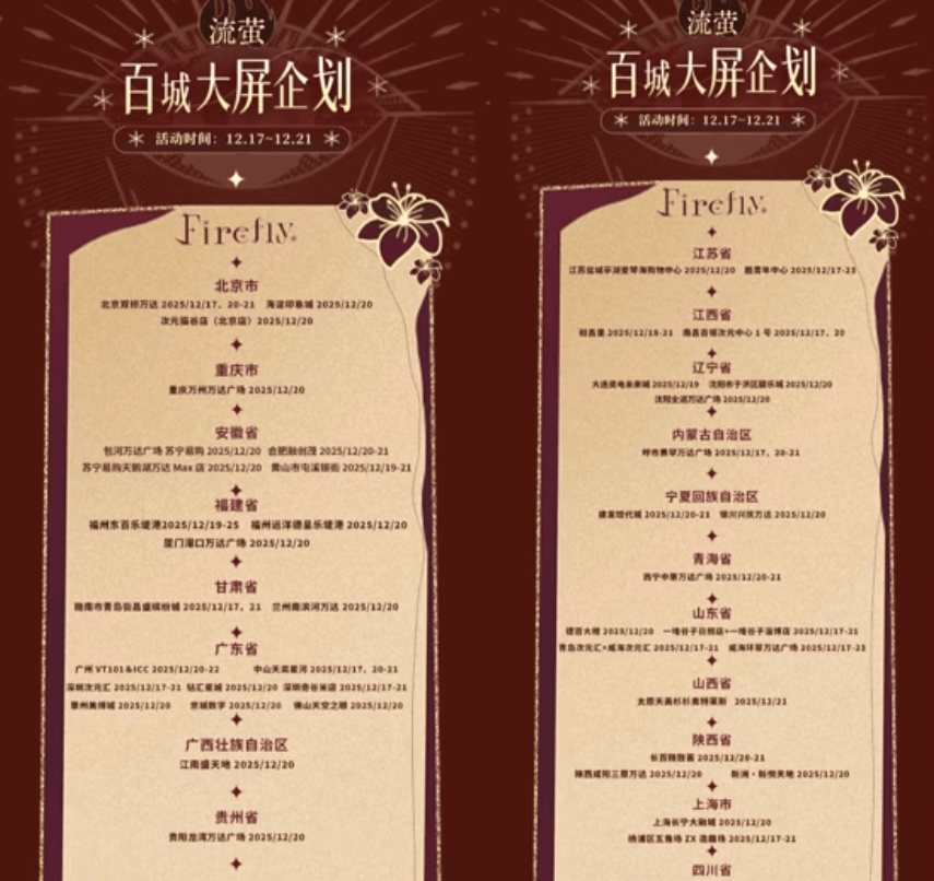 这次活动从12月初开始筹备举办,在网上已经可以看到大量玩家在线下的打卡记录,河南的无线城购物中心有巨大的流萤屏,占据了大楼大半的位置,十分抢眼。