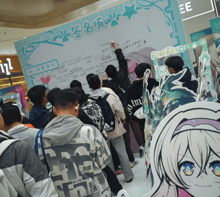 在应援现场布置的签名板上,无数玩家自发排队领取记号笔,书写下对流萤想说的话、想念的词,庆祝在3.8版本与流萤的再度相逢。