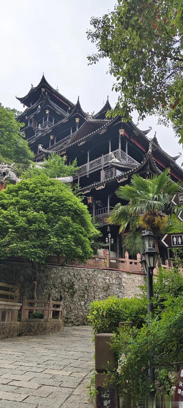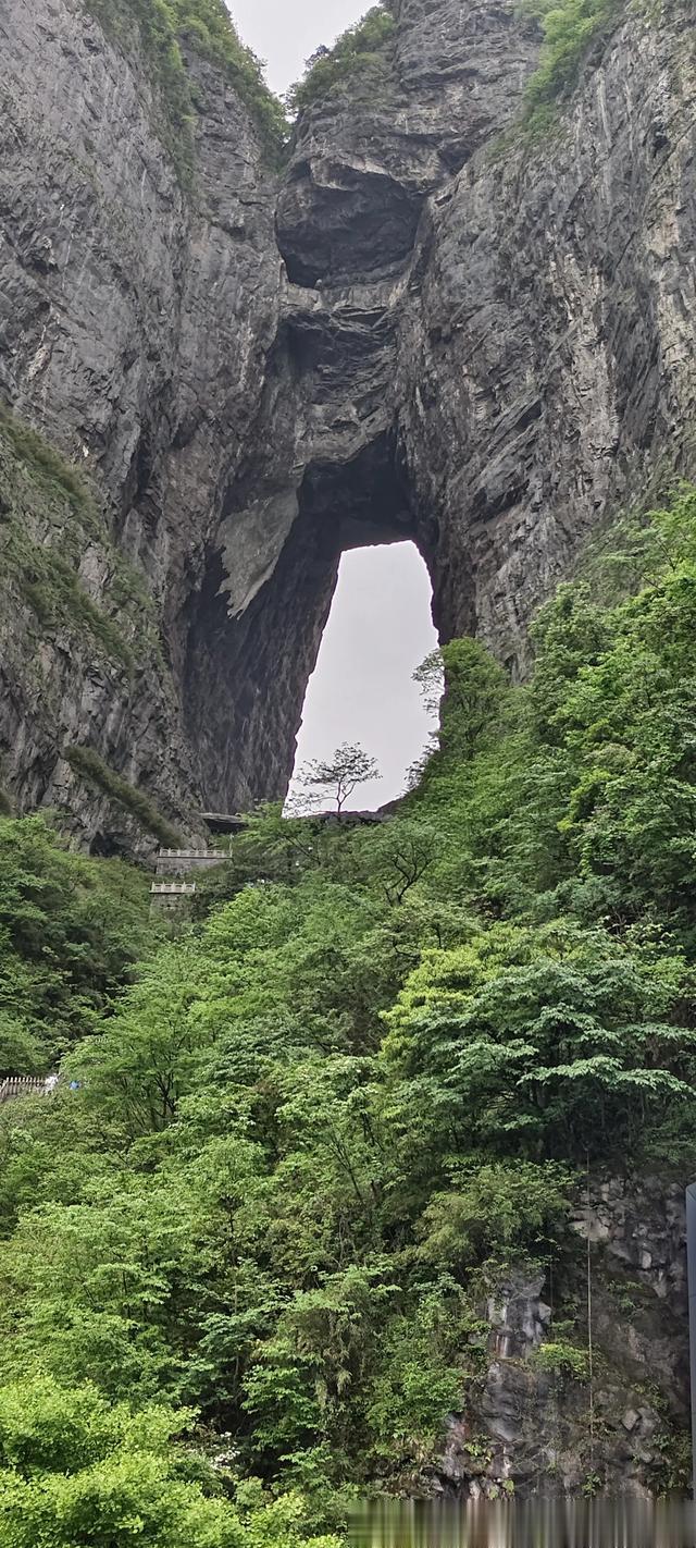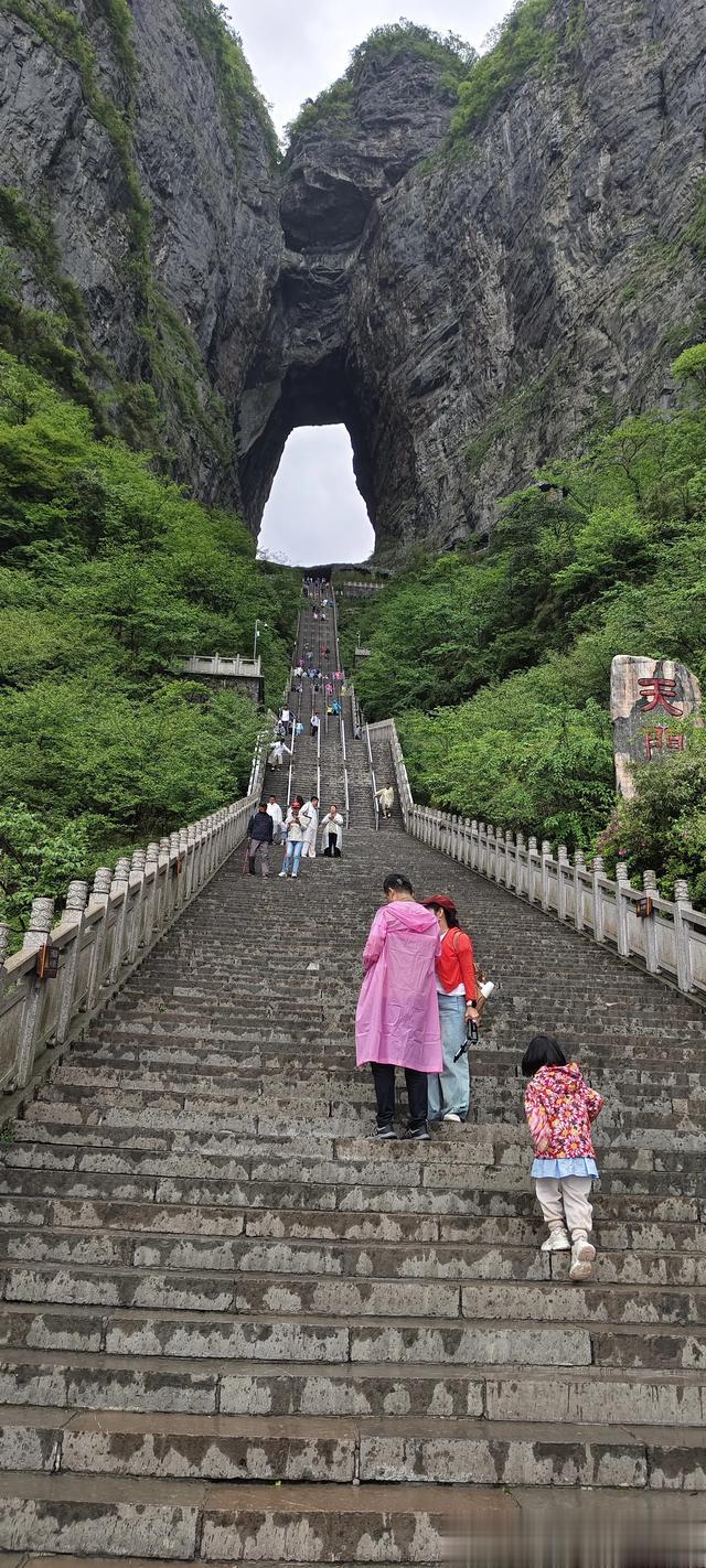 于是我们一路向下,经过七八段,每段五六十米长的下行电动扶梯,来到了天门洞脚下正前方的一处宽大的观景平台上。这里正对着天门洞,有千级台阶可以直达洞口,来回攀爬上去,没有半个小时可能走不了。因为时间的关系,团队里面有两个年过七十的老同志,加上雨天路滑,大家没有选择攀爬天梯登洞游览,只是在观景平台上拍照打卡。