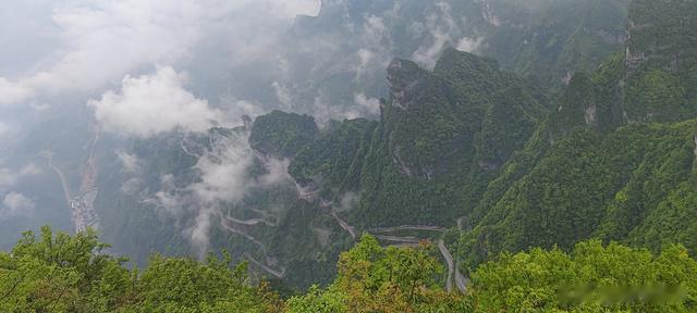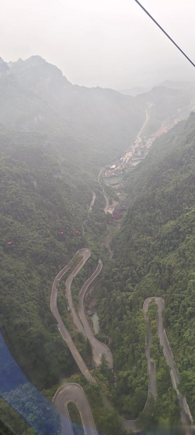 排了两小时,上山只需要三十分钟。与乘坐普通观光车不一样的是,在缆车里观赏风景的体验感很好,居高临下,九十九道拐如同屈曲的羊肠尽收眼底。与晴天不同,下雨的时候,云遮雾罩,缆车穿行于雨雾之中,有腾云驾雾的神仙一样的感受,想来,万能的悟空翻个筋斗云顶多也不过如此。
