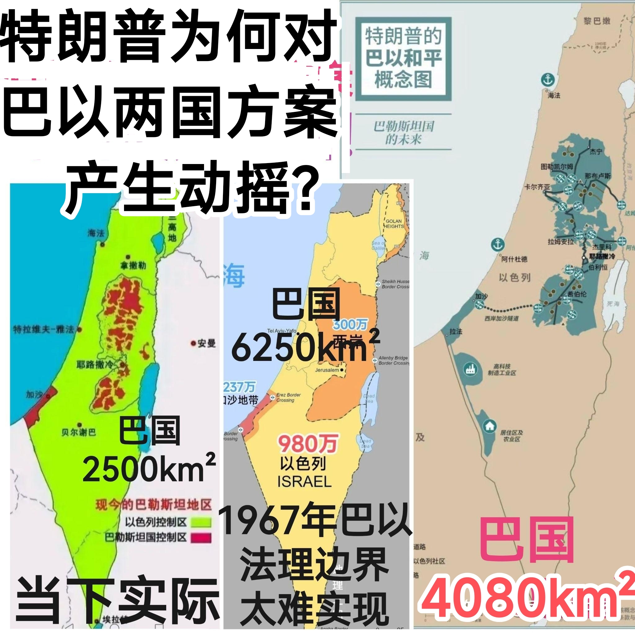 我们都知道目前超过三分之二的联合国会员国已承认巴勒斯坦国。国际社会普遍认为,解决巴勒斯坦问题的唯一出路在于落实“两国方案”,即建立以1967年第三次中东战争以前的边界为基础、以东耶路撒冷为首都、享有完全主权、独立的巴勒斯坦国。这个受到国际社会普遍承认的巴勒斯坦国的面积为6250平方米公里,比我国的上海市面积略小。包括沿海和加沙地带和内陆地区的约旦河西岸。而8年前的特朗普的巴以两国方案是什么样的呢?还是以约旦河西岸和加沙地带为基础,巴勒斯坦的国土面积为4080平方公里,比国际社会普遍承认的巴勒斯坦国面积小了2170平方公里。而目前巴勒斯坦实际控制的面积是多少呢?答案是约2500平方公里。也就是说8年前特朗普的巴以两国方案,就是让巴以两国各退一步。取了一个中间值。让在巴以两国当下实控的面积基础上,再让以色列给巴勒斯坦退地1580平方公里土地,最终彻底划定巴以两国方案。