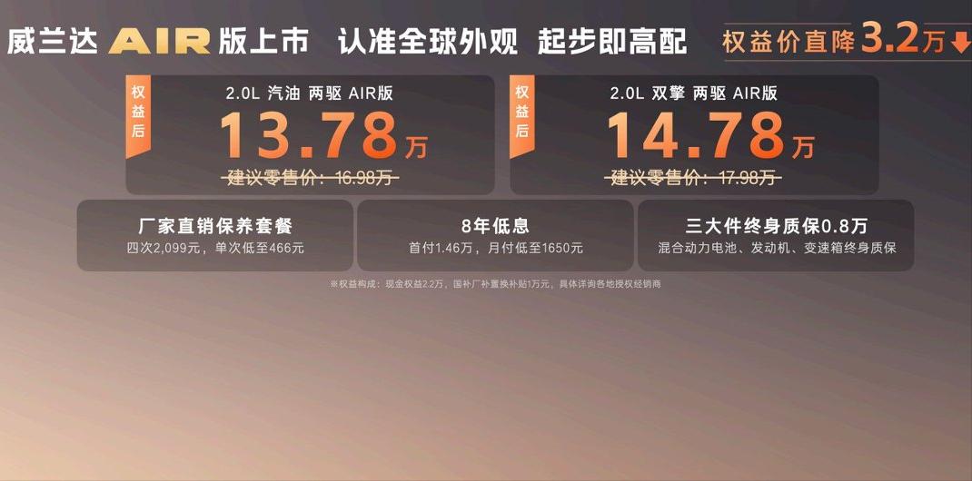一、13.78万起入门即高配,合资中型SUV性价比高威兰达AIR版带来极具竞争力的定价,综合现金优惠、国补与厂补,2.0L汽油版13.78万、2.0L混动版14.78万,以紧凑型SUV价格,买到全球中型SUV品质,性价比突出。