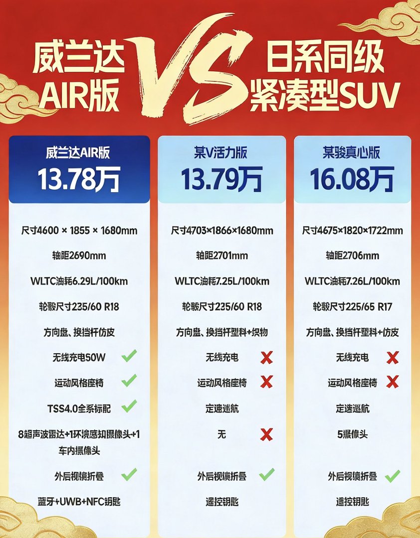 总结威兰达AIR版以全球品质、入门满配、强悍机械、实用智驾、超低用车成本五大核心优势,在13-15万级SUV市场树立新标杆。不玩噱头、不搞减配,用实在配置、亲民价格、贴心政策,真正做到为家庭用户着想。