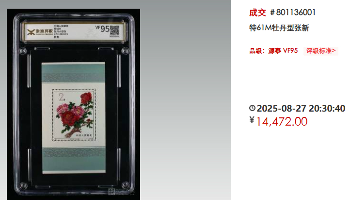 这枚特61M牡丹型张新票,可以说评级分数越高越吃香。只是一分之差,与同期成交的相比——25年8月27成交的这枚源泰VF95分的牡丹型张价格为14472元,而此前8月20日成交的源泰VF96分价格为34020元,几乎是超两倍的变化!也足以说明大家对高分好品相邮票的极致追求。