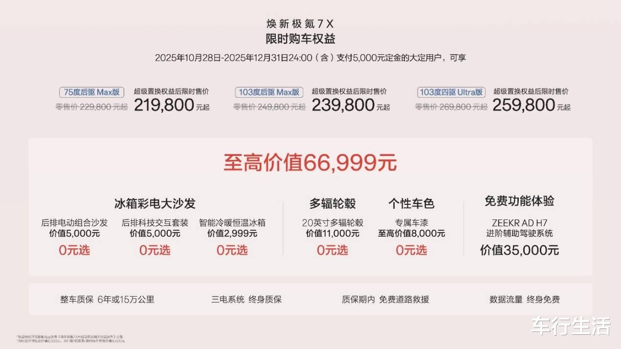 此次焕新,极氪7X针对不同家庭场景布局:75度后驱Max版适配三口之家日常通勤,103度后驱Max版满足多代家庭跨省出游,103度四驱Ultra版契合年轻家庭对性能的追求。官方价22.98万-26.98万元,叠加置换权益后限时下探至21.98万起,用户可通过极氪App、官网或线下门店便捷预定。