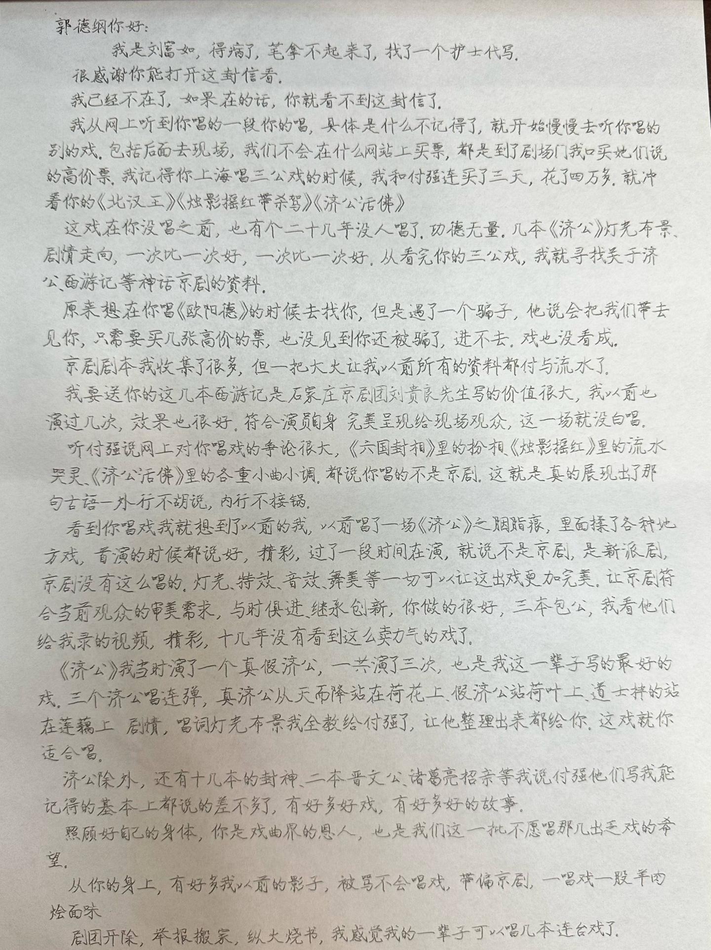 原来,这位刘富如老人生病身体已经不行了,连笔都拿不起来,所以委托护士代写了这封信,在信里,刘富如老师说自己在网上听到了郭德纲唱的戏,觉得非常好,然后和一个叫付强的人在线下花了四万多听了郭德纲的几段戏。