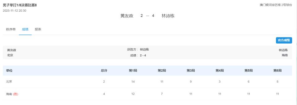 北京时间11月12日,2025年第十五届全运会男单16强战,赛会二号种子、男单世界排名第二的林诗栋遭遇险情。林诗栋在对阵同龄的国乒队友北京队的黄友政的时候,在12-14、7-11输掉前两局的情况下,以11-9、11-3、11-6、11-8实现逆转。林诗栋的八强战对手是上海的直板球员赵子豪,后者16强战4-1胜马特。