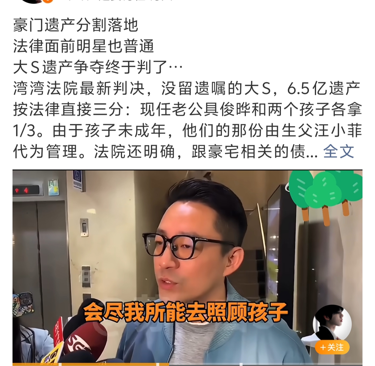 一则关于大S天价遗产分割的法院判决书,在娱乐圈投下了一枚重磅炸弹!6.5亿新台币遗产最终依法三分,现任丈夫具俊晔与两个孩子各得三分之一,而此前备受关注的大S母亲却未获分文,这一结果让无数网友直呼意外,也让这场持续数月的遗产争夺战终于画上句号。