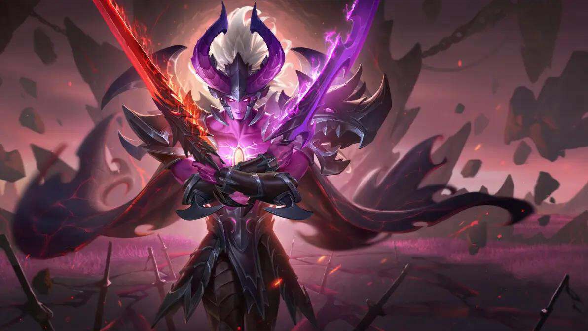 然后是宫本武藏的地狱之眼,这款皮肤也和貂蝉的仲夏夜之梦一样,在设计上其实就比较独特,地狱暗黑系列的风格,而且两把刀的颜色还不同,海报图所展现出来的效果确实非常霸气。
