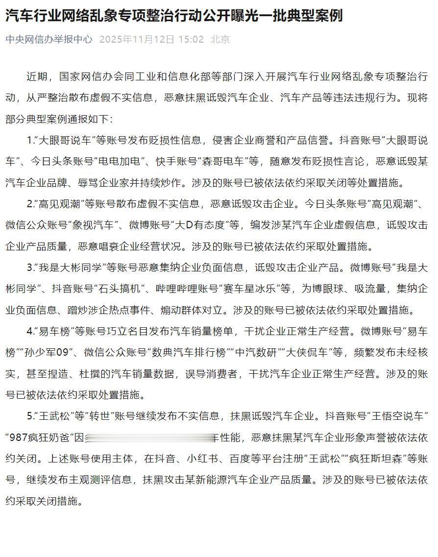 近年来,部分自媒体将"拉踩同行"当作流量密码,甚至形成"一周五天黑"的畸形业态。它们歪曲事实诋毁产品性能,恶意抹黑企业声誉,不仅误导消费者决策,更分流企业研发投入,侵蚀产业高质量发展的根基。此类行为已被中央网信办专项整治行动点名打击,相关账号被依法关闭。