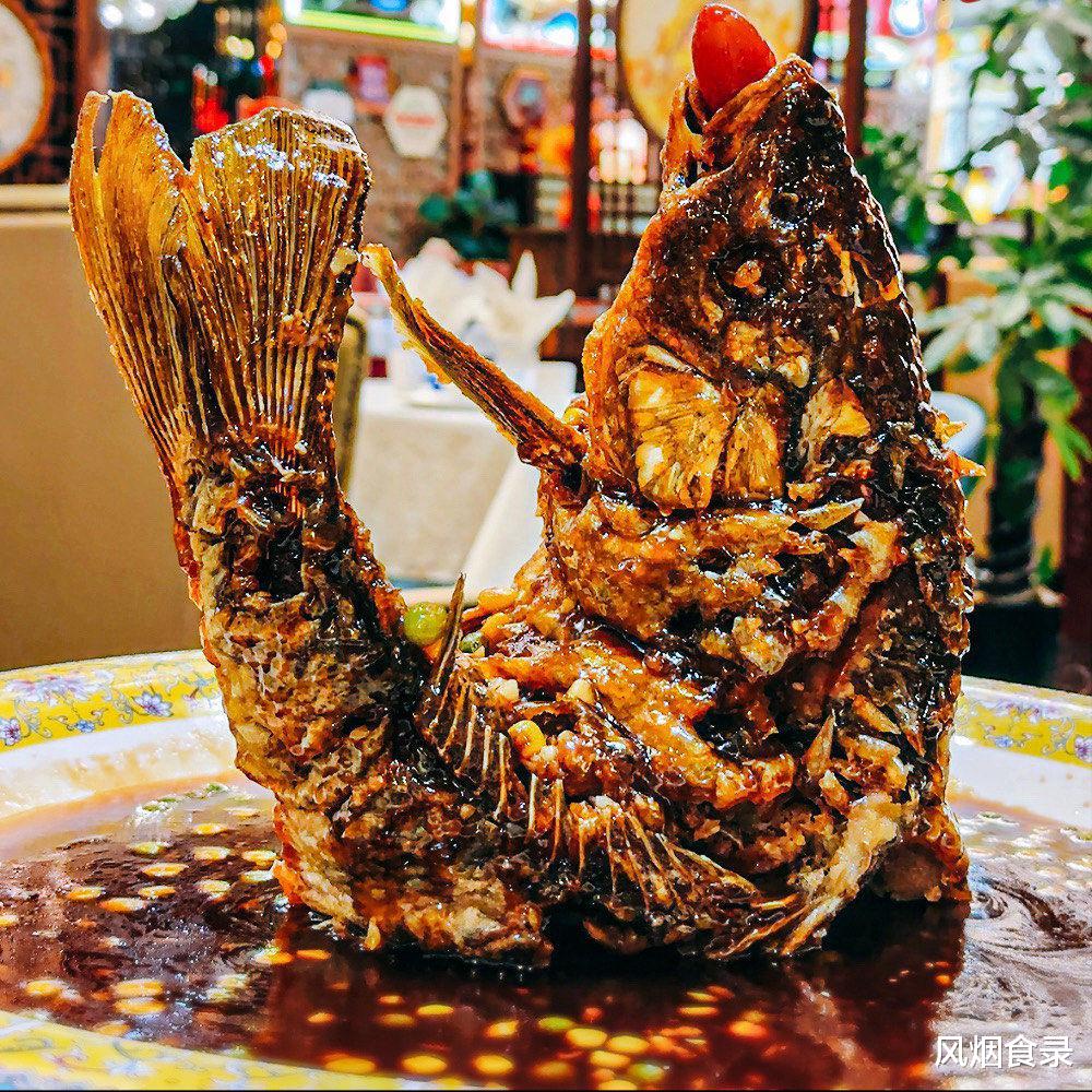 其形如活鲤蹦跳,鳞骨酥脆“咔嚓”响,肉质鲜嫩多汁,酸甜卤汁裹挟花椒香,