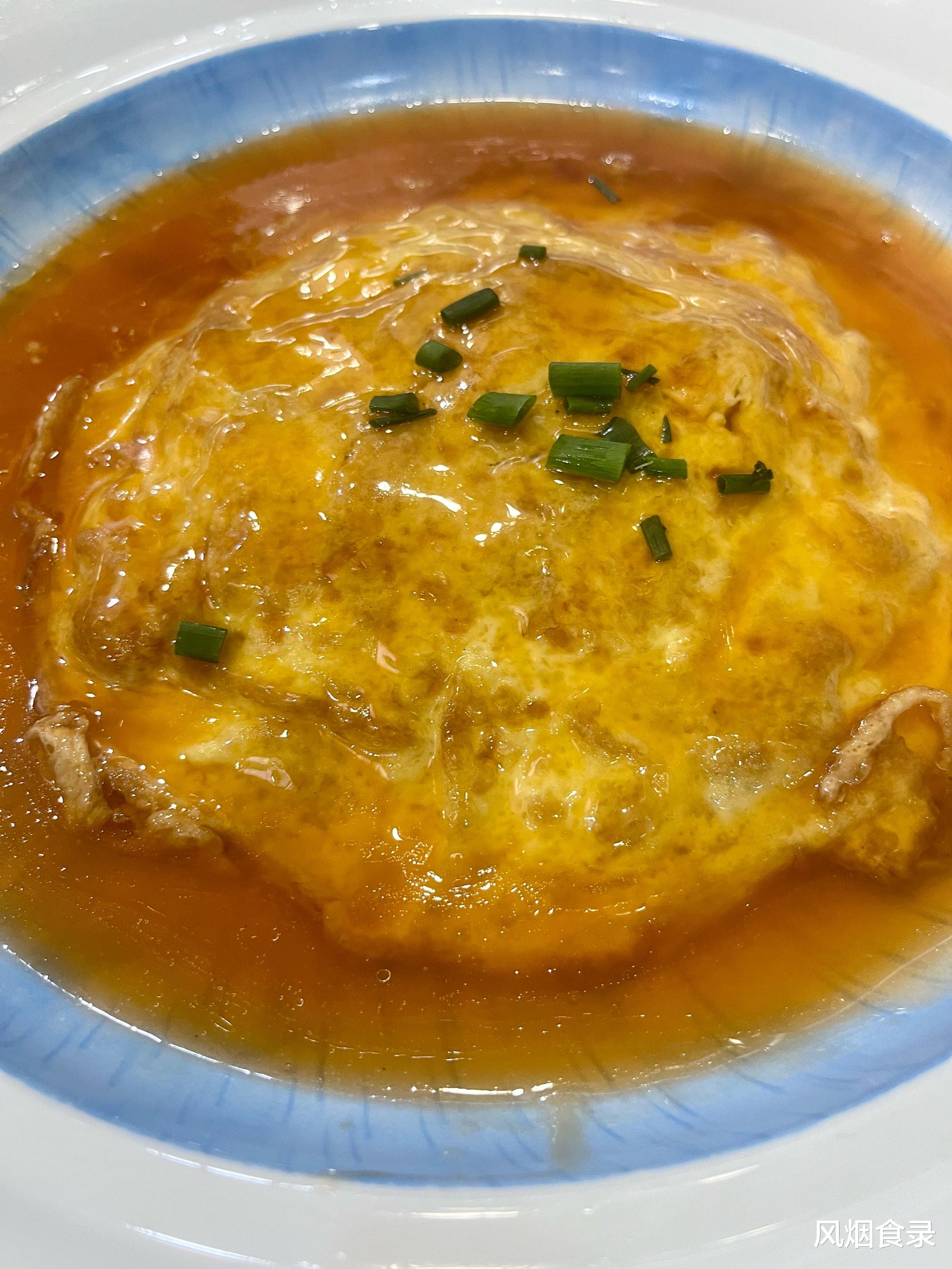 里脊切片裹粉,蛋液煎至金黄,再煨入高汤收汁,咬开酥壳,