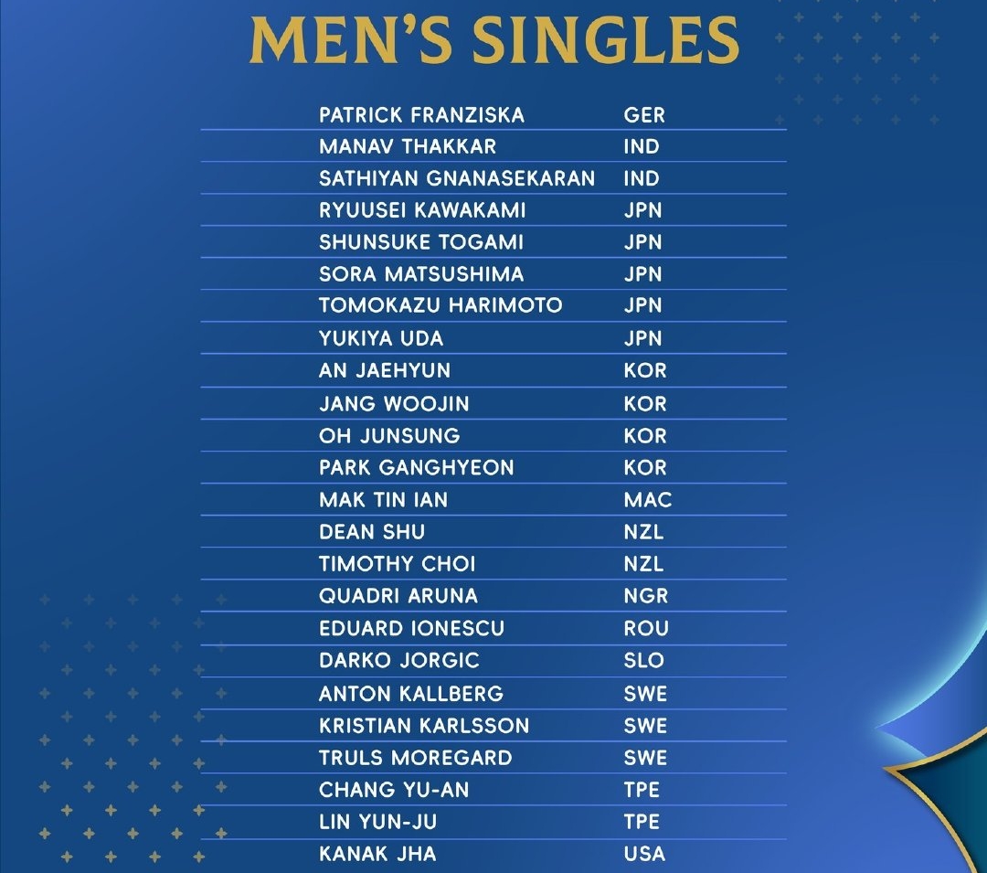 布洛斯、瓦伊什、西富恩特斯、卢伟、林文政、卡尔德拉诺、王臻、梁靖崑、林诗栋、王楚钦、温瑞博、周启豪、扬卡里克、普卡、林德、格罗特、奥马尔、艾利克斯勒布伦、菲利克斯勒布伦、西蒙高茨、泊雷特、杜达、邱党、奥恰洛夫、弗朗西斯卡、塔卡、加纳纳塞卡然、川上流星、户上隼辅、松岛辉空、张本智和、宇田幸矢、安宰贤、张禹珍、吴晙诚、朴康贤、麦天恩、舒迪恩、崔·托马斯、阿鲁纳、爱德华约内斯库、达科、卡尔伯格、卡尔松、莫雷高德、张佑安(中国台北)、林昀儒(中国台北)、卡纳克
