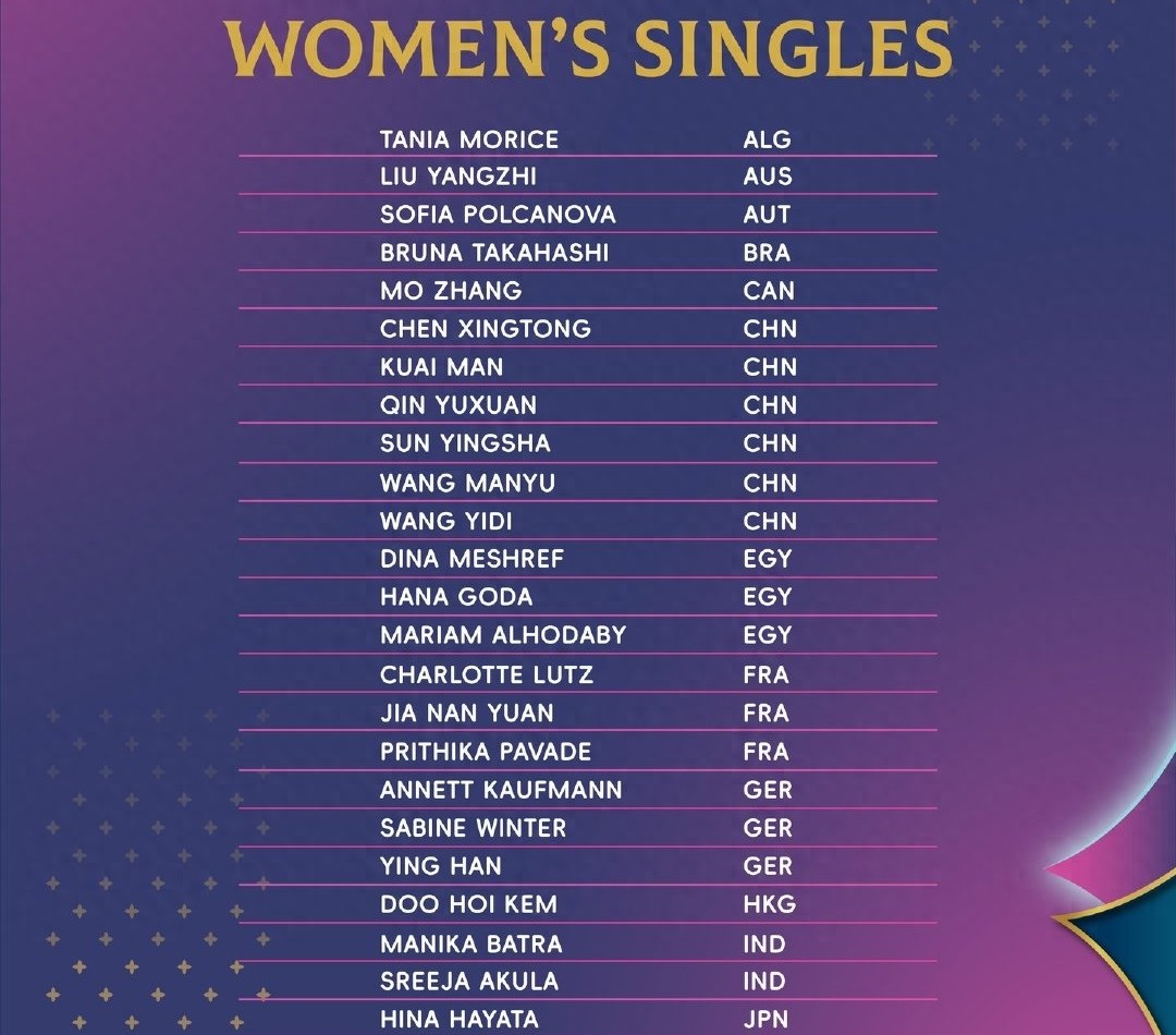 莫里斯、刘杨子、波尔卡诺娃、高桥.布鲁娜、张默、陈幸同、蒯曼、覃予萱、孙颖莎、王曼昱、王艺迪、梅谢芙、汉娜.高达、阿尔霍达比、夏洛特.卢茨、袁嘉楠、帕瓦德、考夫蔓、温特、韩莹、杜凯琹、巴特拉、阿库拉、早田希娜、桥本帆乃香、伊藤美诚、张本美和、金娜英、李恩惠、申裕斌、LEONG ON NA、李春丽、乔思琳、吉雷、巴约尔、付玉、迪亚兹、德拉戈曼、斯佐科斯、萨马拉、曾尖、郑怡静(中国台北)、李昱谆(中国台北)、叶伊恬(中国台北)、伯格斯特隆、赫尔希、王艾米、张安