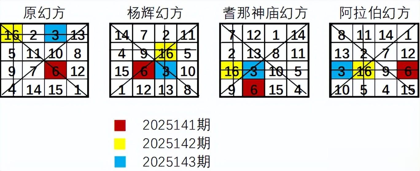 1、2025144期蓝球给出标准幻方(原幻方)和三个经典完美幻方图,如下图。