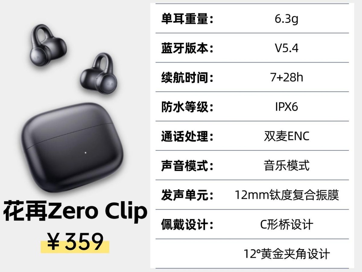 花再Zero Clip:这款耳机用的是12°黄金夹角加C形桥的设计,能很好贴合耳朵形状,运动戴也很稳,但它单耳重6.3g,在同类耳机里偏重,戴久了容易出现夹耳的情况。