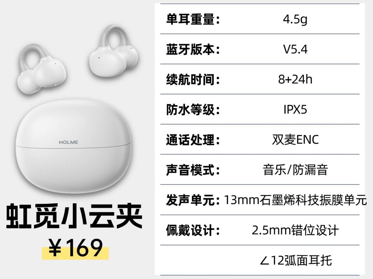 虹觅小云夹:和市面上其他耳夹式耳机相比,虹觅Clip Pro在佩戴体验上确实花了不少心思,舒适度和稳定性都很在线。单只耳机只有4.5g,长时间佩戴也不会有明显压耳感;它还专门做了12°弧面耳托,电池部位能贴合耳背,进一步提升舒适度;再加上2.5mm错位设计,戴上后自然前高后低,更贴合耳形,日常活动也不容易掉。