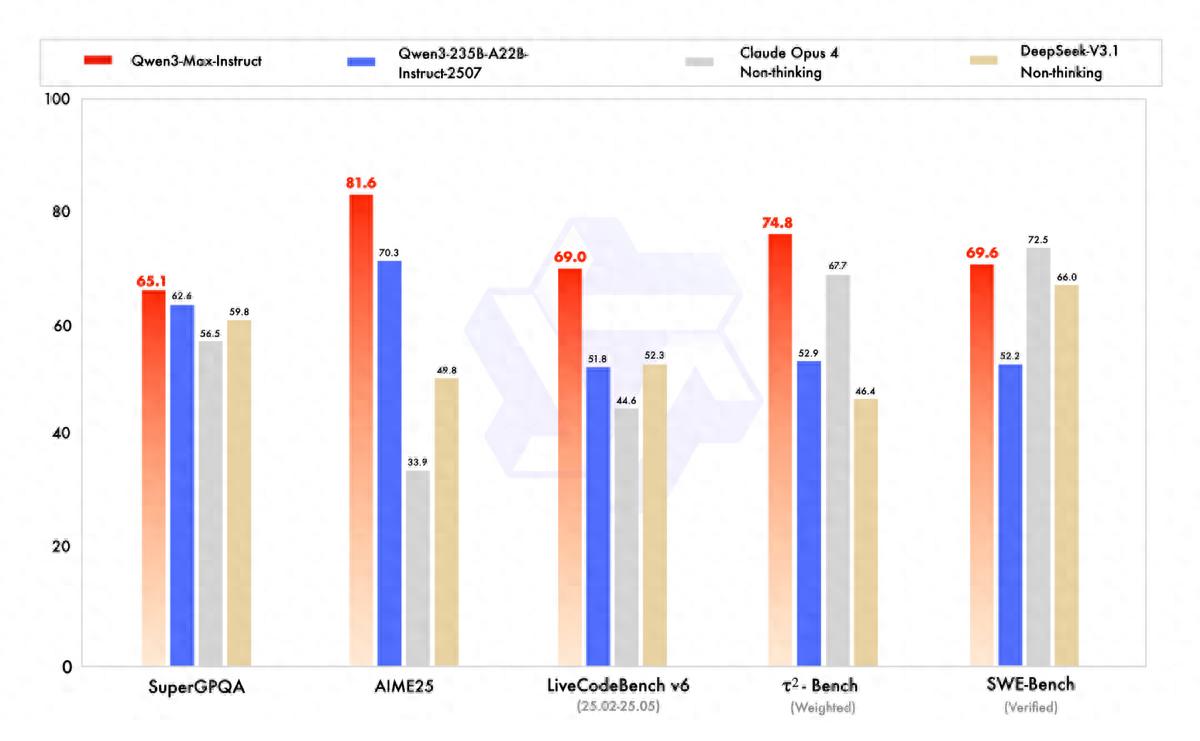Qwen3-Max为通义千问家族中最大、最强的基础模型。该模型预训练数据量达36T tokens,总参数超过万亿,拥有极强的Coding编程能力和Agent工具调用能力。在大模型用Coding解决真实世界问题的SWE-Bench Verified测试中,Instruct版本斩获69.6分,位列全球第一梯队;在聚焦Agent工具调用能力的Tau2-Bench测试中,Qwen3-Max取得突破性的74.8分,超过Claude Opus4和DeepSeek-V3.1。