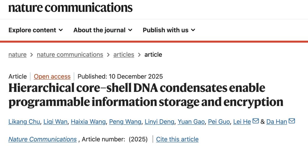 12月10日,《Nature Communications》在线发表了一项DNA存储领域的研究,题为Hierarchical core–shell DNA condensates enable programmable information storage and encryption。中国科学院杭州医学研究所的团队开发了一种基于分层核壳DNA凝聚体的全新分子信息平台,让DNA从一个静态的数据档案库,跃升为一个动态、可编程、具备内在计算与加密能力的智能信息处理系统。本篇论文的通讯作者为中国科学院杭州医学研究所的何磊副研究员、韩达研究员。
