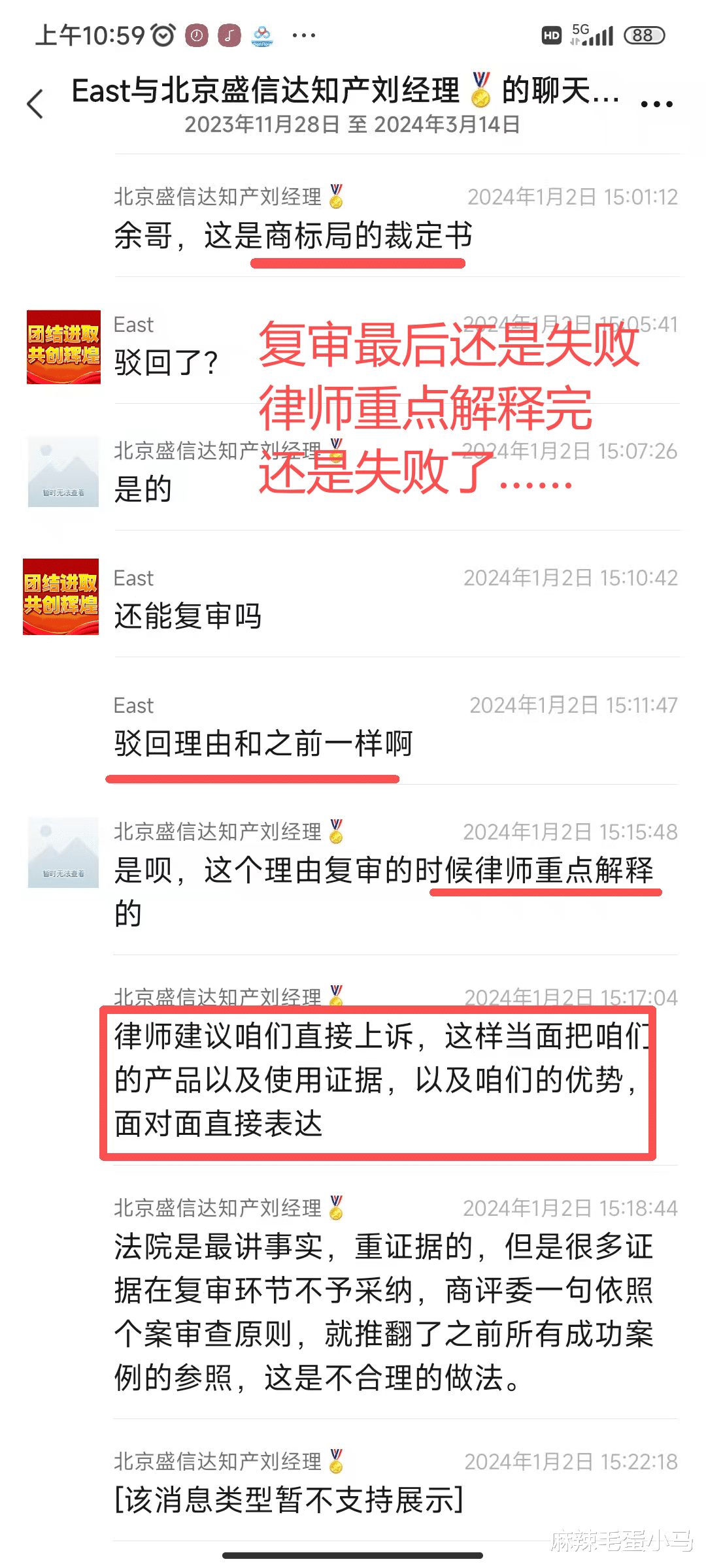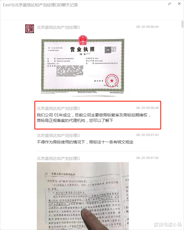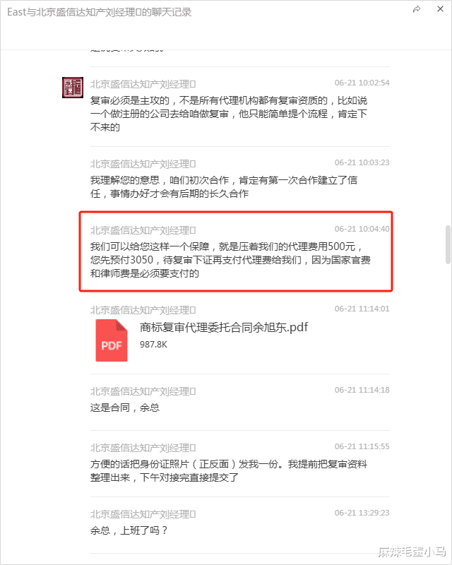 去年6月,我的商标被驳回后联系到盛信达的刘经理。她反复强调“肯定能下”,还主动提出可以先付大部分钱,留500元代理费,等复审成功再付。我签了合同,付了3050元。