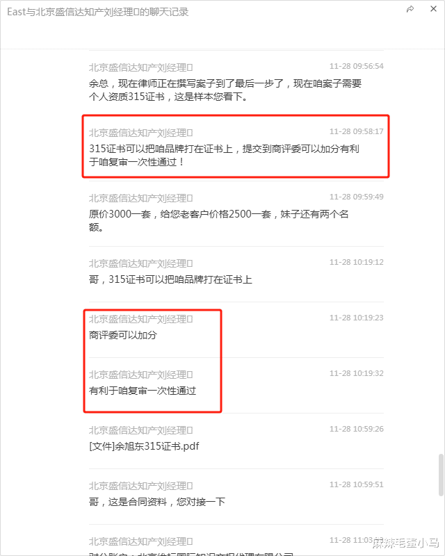 等到11月,刘经理突然联系我,说需要做一个“个人资质315证书”,给商标“加分”,报价2500元。我当时有疑问,但没办。