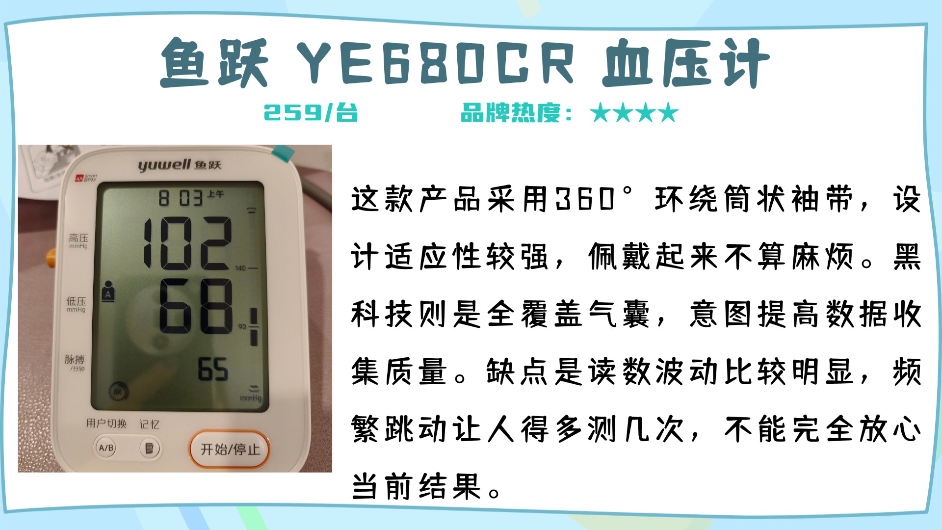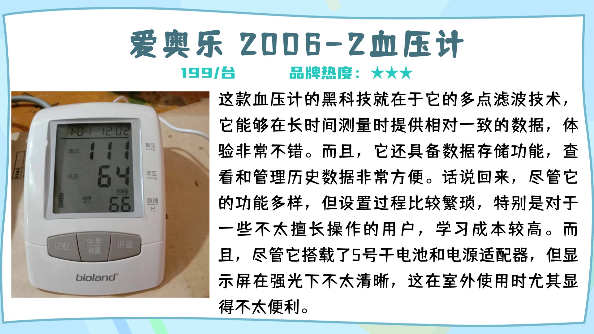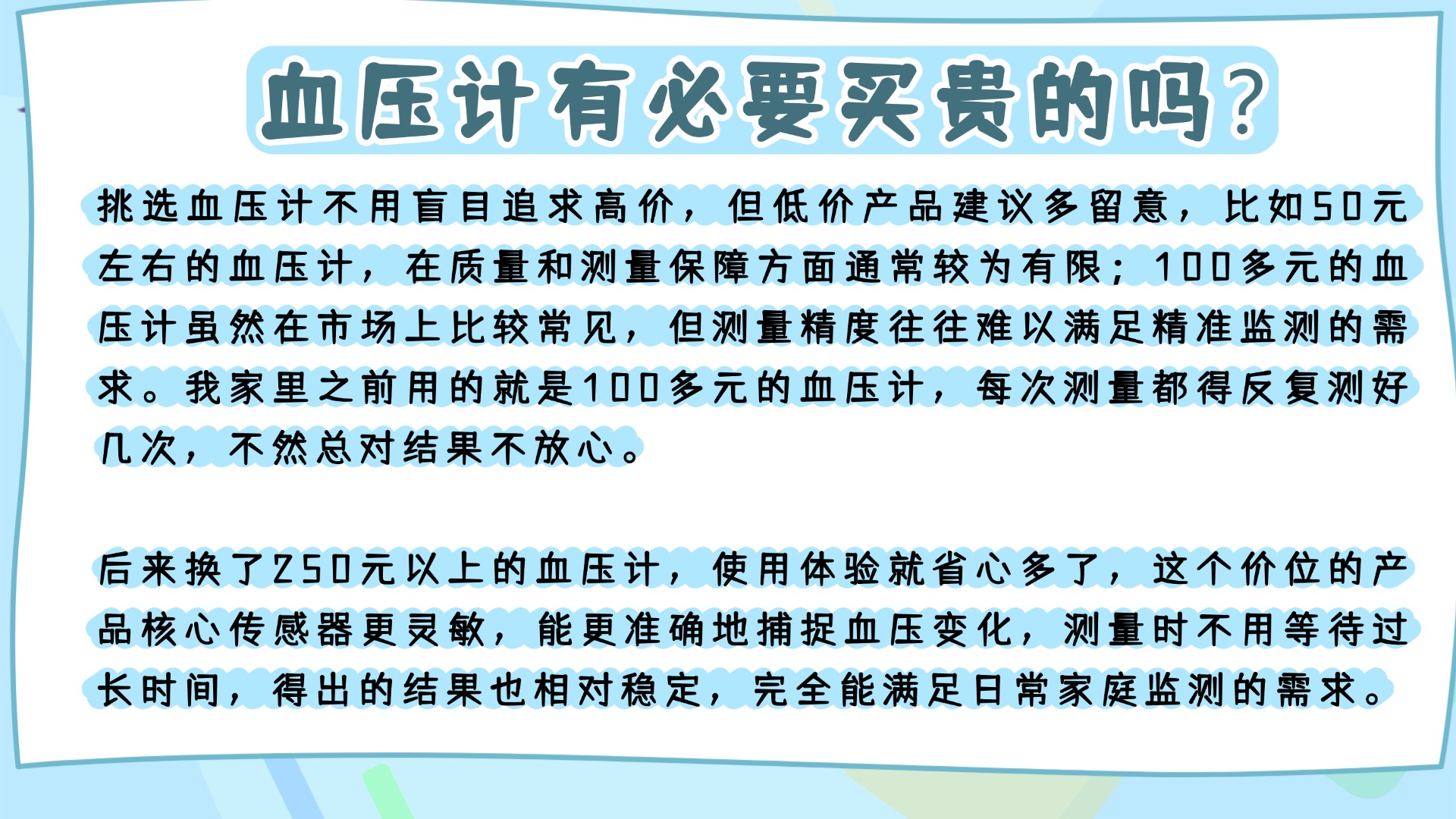 100 多块钱的血压计值得买吗?别只看附加功能忽略了核心需求!这个价位的血压计就算带有一些额外功能,核心的测量精度也很难保证,我实测过几款带蓝牙功能的,发现数据传输倒是方便,但测量结果却不稳定,稍微换个环境就会波动。而且这类产品的传感器和算法都比较基础,两次测量的数值偏差经常超过合理范围,根本没法满足日常监测的需求。250 元以上的血压计不仅核心精度更靠谱,就算有附加功能也会做足适配,不会出现 “重功能轻精度” 的情况。接下来我会分享血压计选购的实用技巧,全是避坑经验,建议先关注收藏慢慢看!