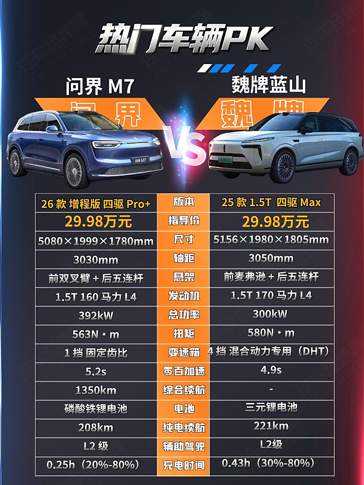 问界M7 2026款增程Pro+四驱版6座指导价为29.98万元,魏牌蓝山2025款四驱Max指导价为29.98万元,两款车价格完全一样,均定位于中大型SUV,而且都面向高端家庭用户,那么哪款车更值得入手呢?