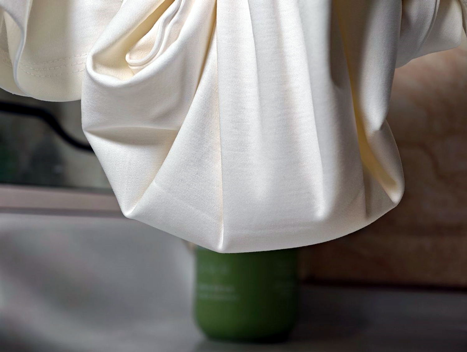 我把牛奶缓缓倒在T恤袖口(日常活动最容易沾到污渍的位置),牛奶接触面料后,立刻凝成圆润的水珠,没有渗透到面料里,也没有挂壁,用纸巾轻轻一擦,水珠就被擦掉,面料上没有留下任何可乐的颜色印记,甚至连一点黏腻感都没有。