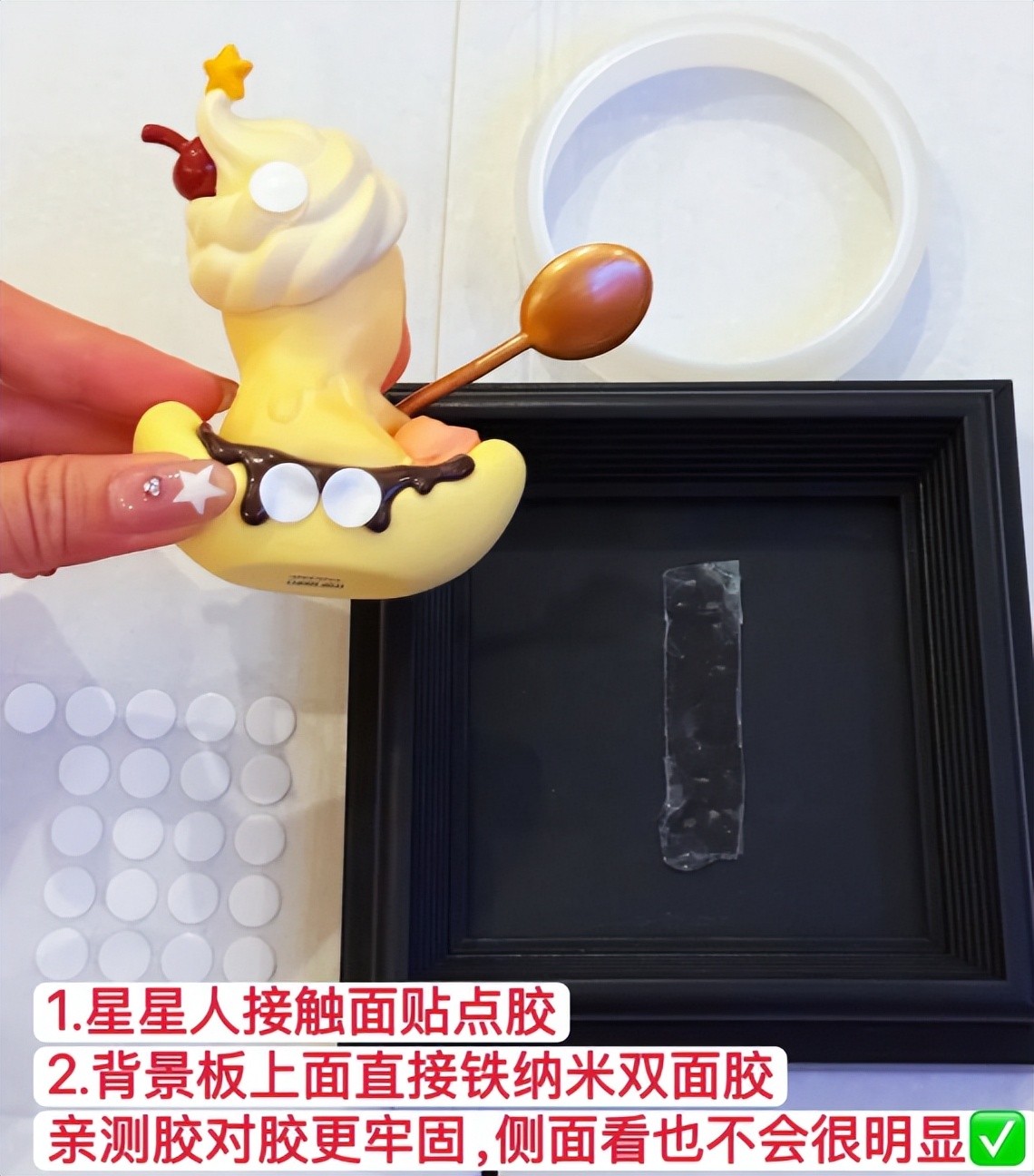 把盲盒接触面粘贴点胶,背景板贴上纳米胶。