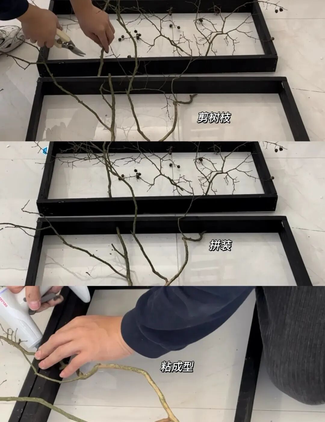 小区里面捡到的树枝,修剪一下,打磨一下,拼装、粘贴在画框上面,如果担心热熔胶不够牢固,就用绳子绑一下。