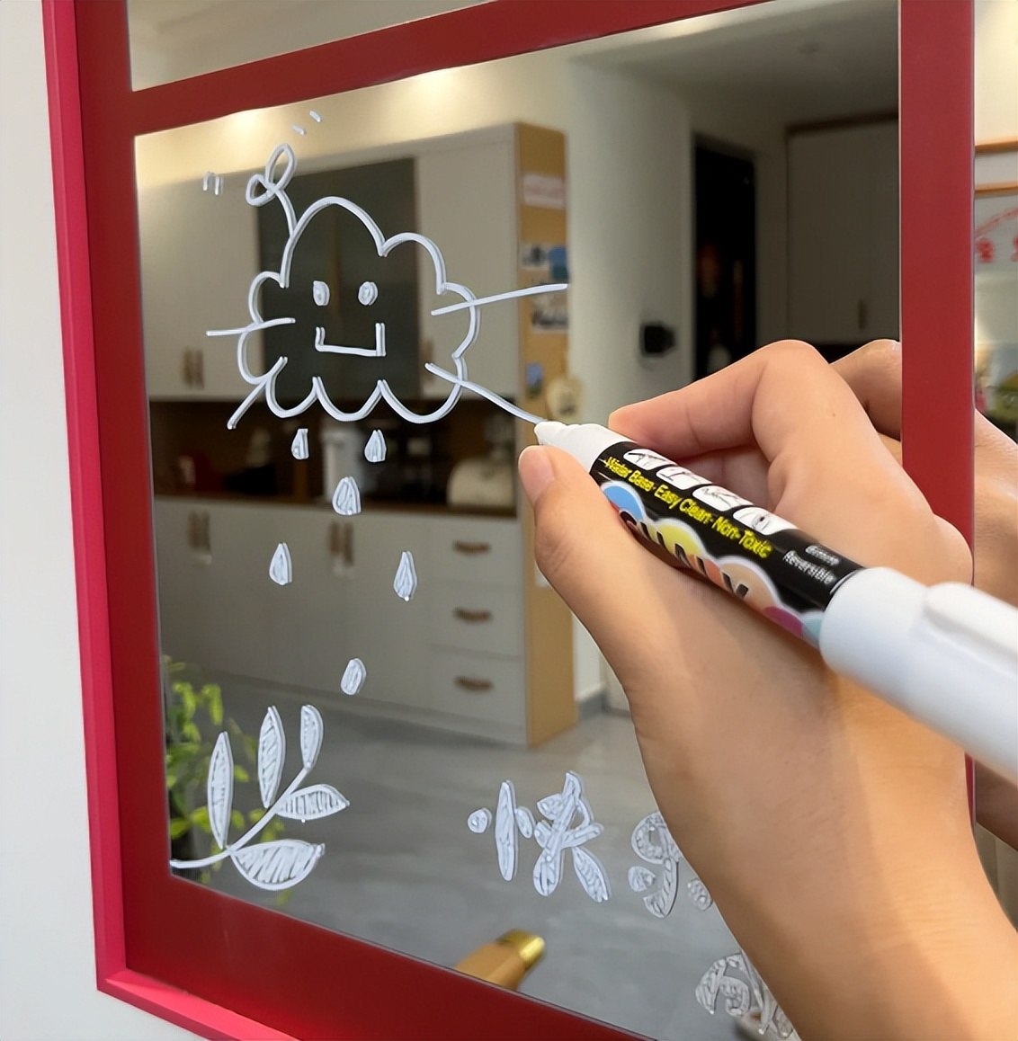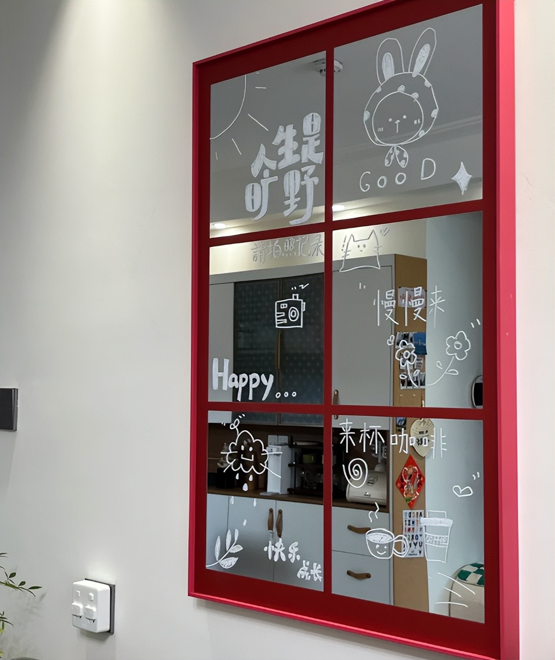 选择一面什么都不带的镜子,挂好了之后,买一些贴纸,直接贴在镜子上,或者买一些丙烯笔,在镜子上画画。