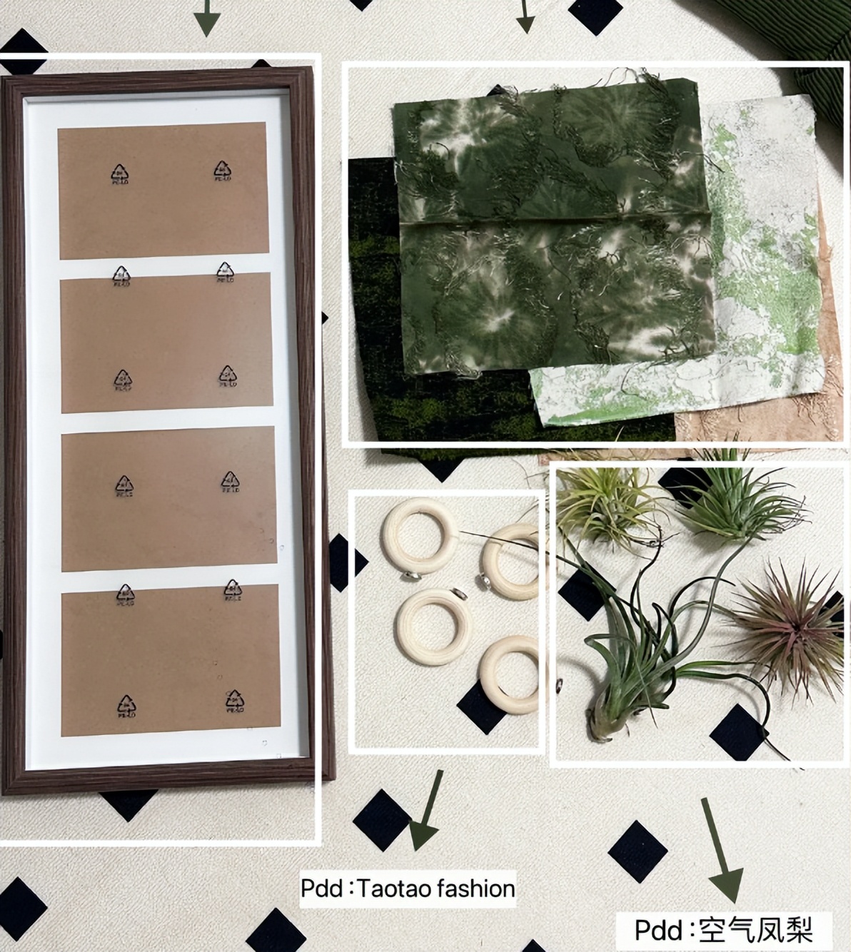 1)准备材料:画框、布料、木环、磁吸贴、空气凤梨。