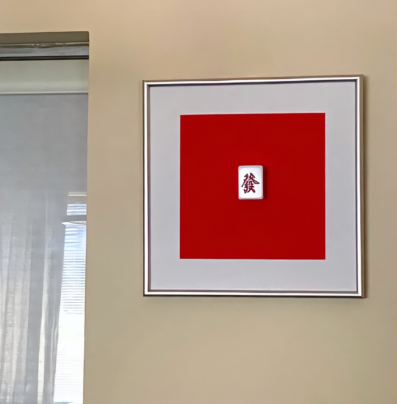 把麻将“发”字,用热熔胶直接粘贴在装饰画的画心里面,再把画框装好,固定在墙上。