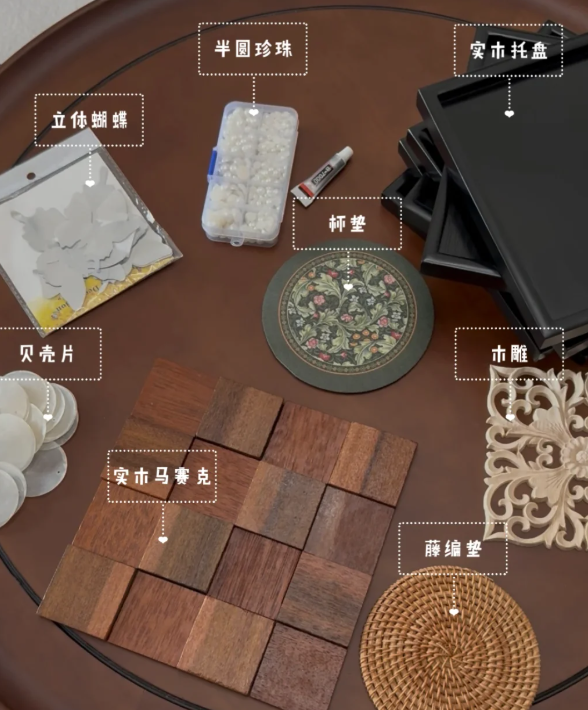半圆珍珠、实木托盘、杯垫、木雕、藤编垫、实木马赛克、贝壳片、立体蝴蝶、热熔胶。