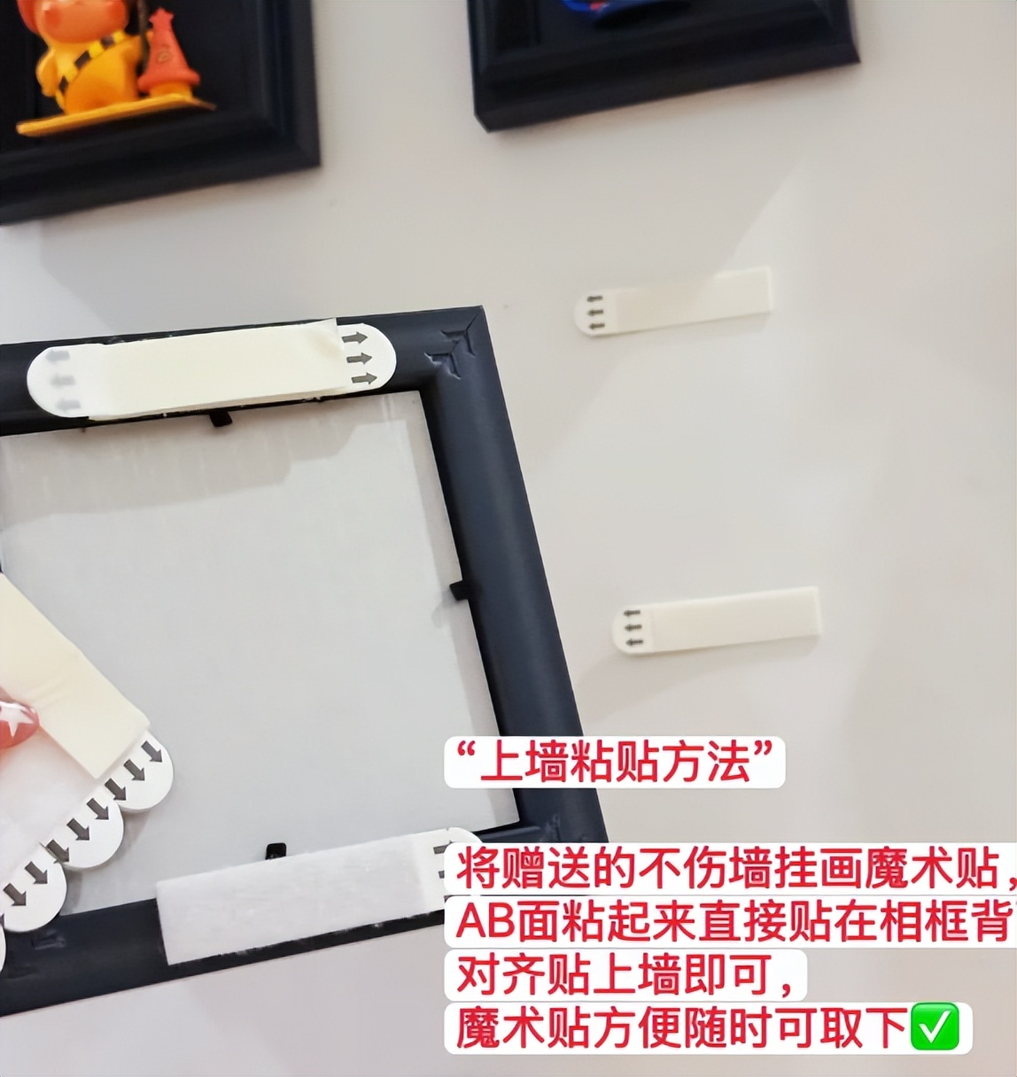 我是用这种不伤墙的魔术贴粘贴挂画,对齐就能上墙。