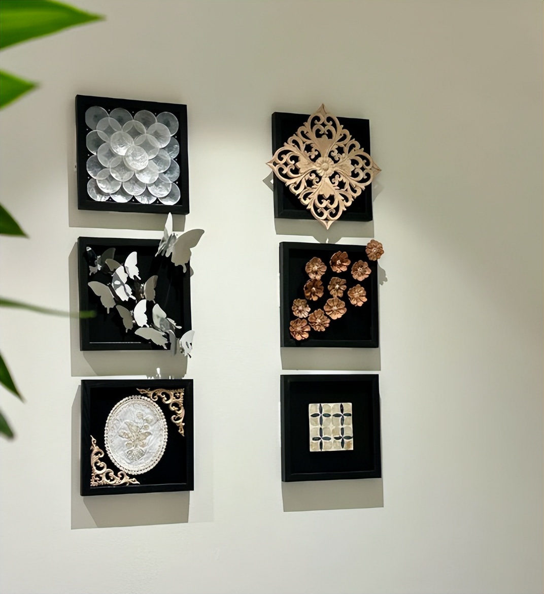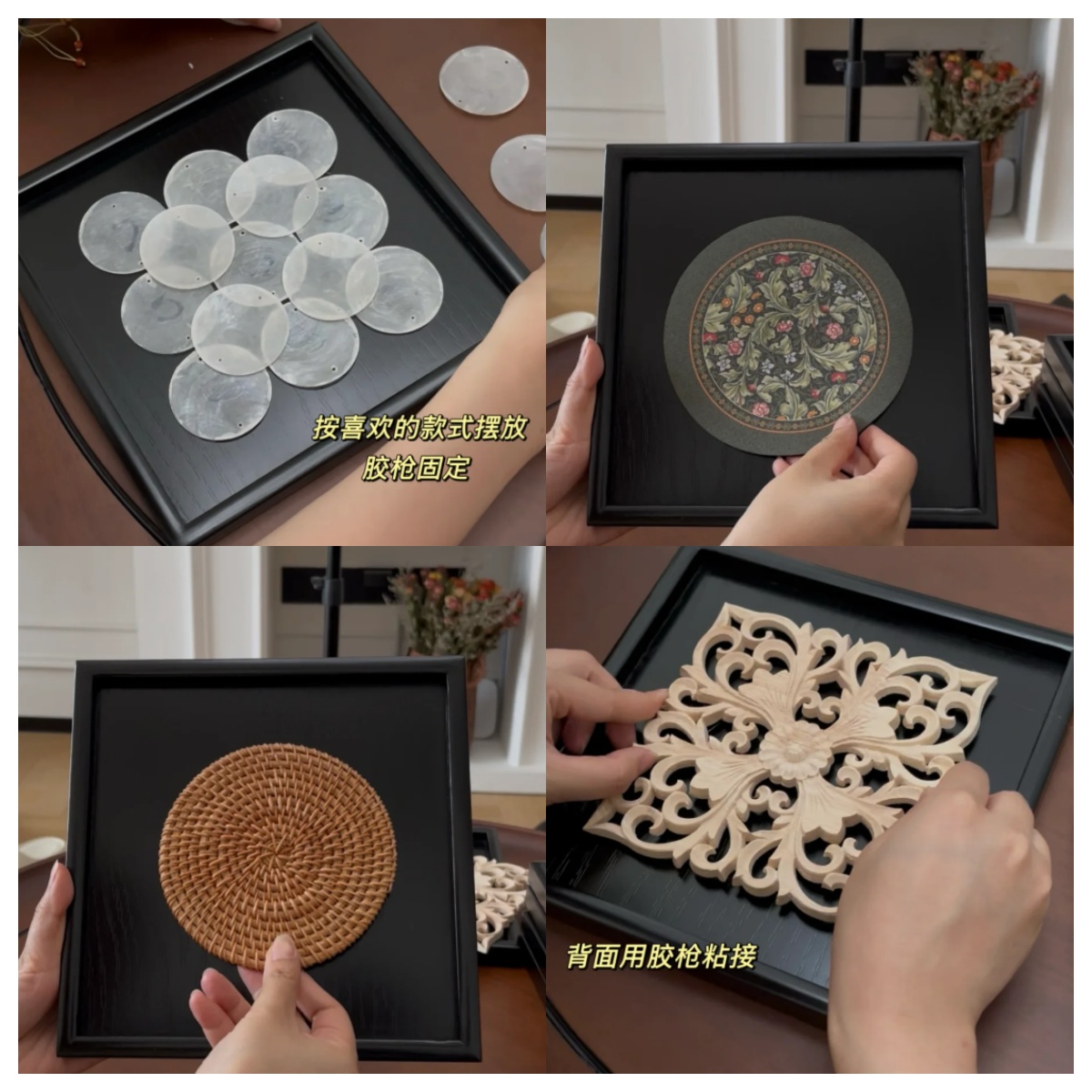 把这些材料,用热熔胶直接粘贴在黑色的实木托盘上面,一幅装饰画就diy好了。