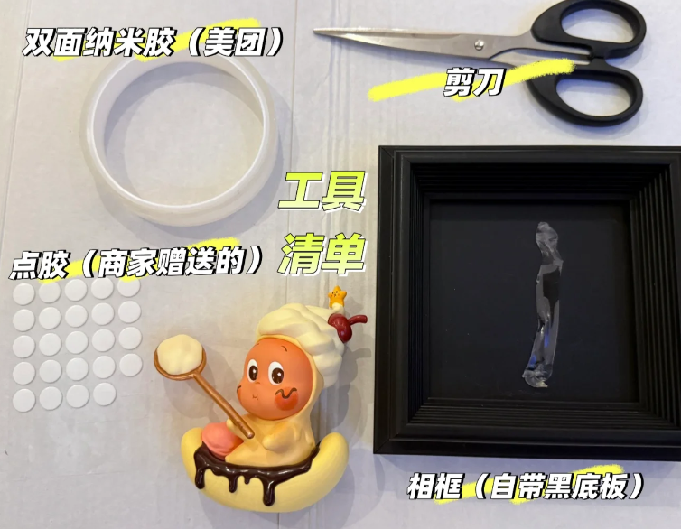 双面纳米胶、剪刀、点胶、相框、魔术贴。