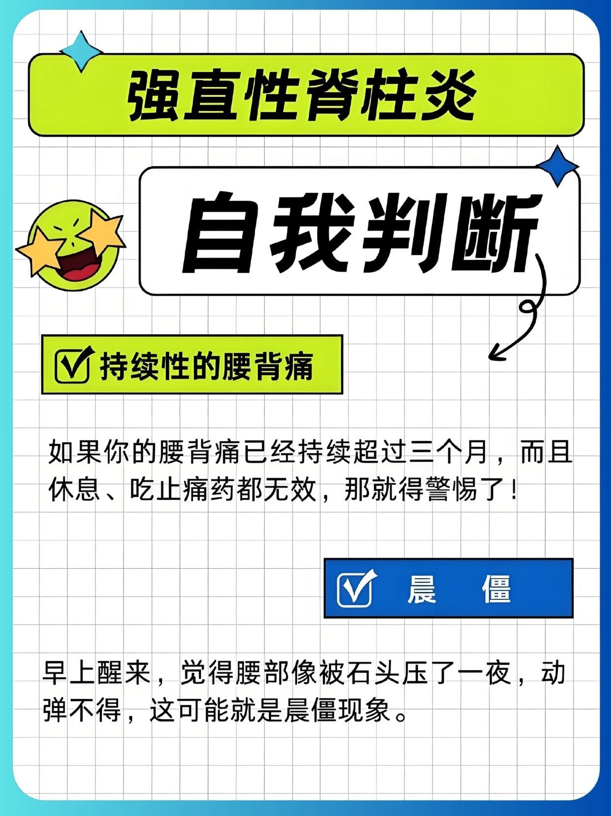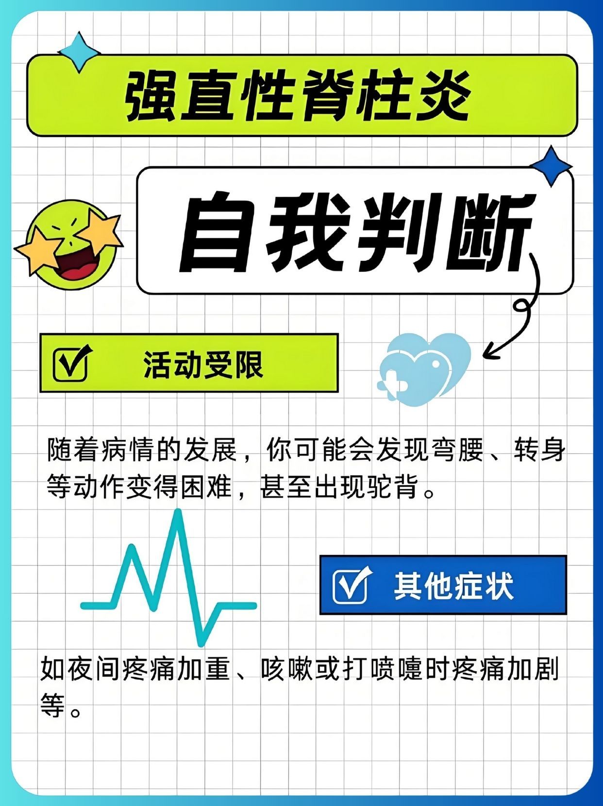 ▸ ⚠️ 区别:普通疲劳僵硬通常10分钟内缓解,强直性脊柱炎可能持续1小时以上。
